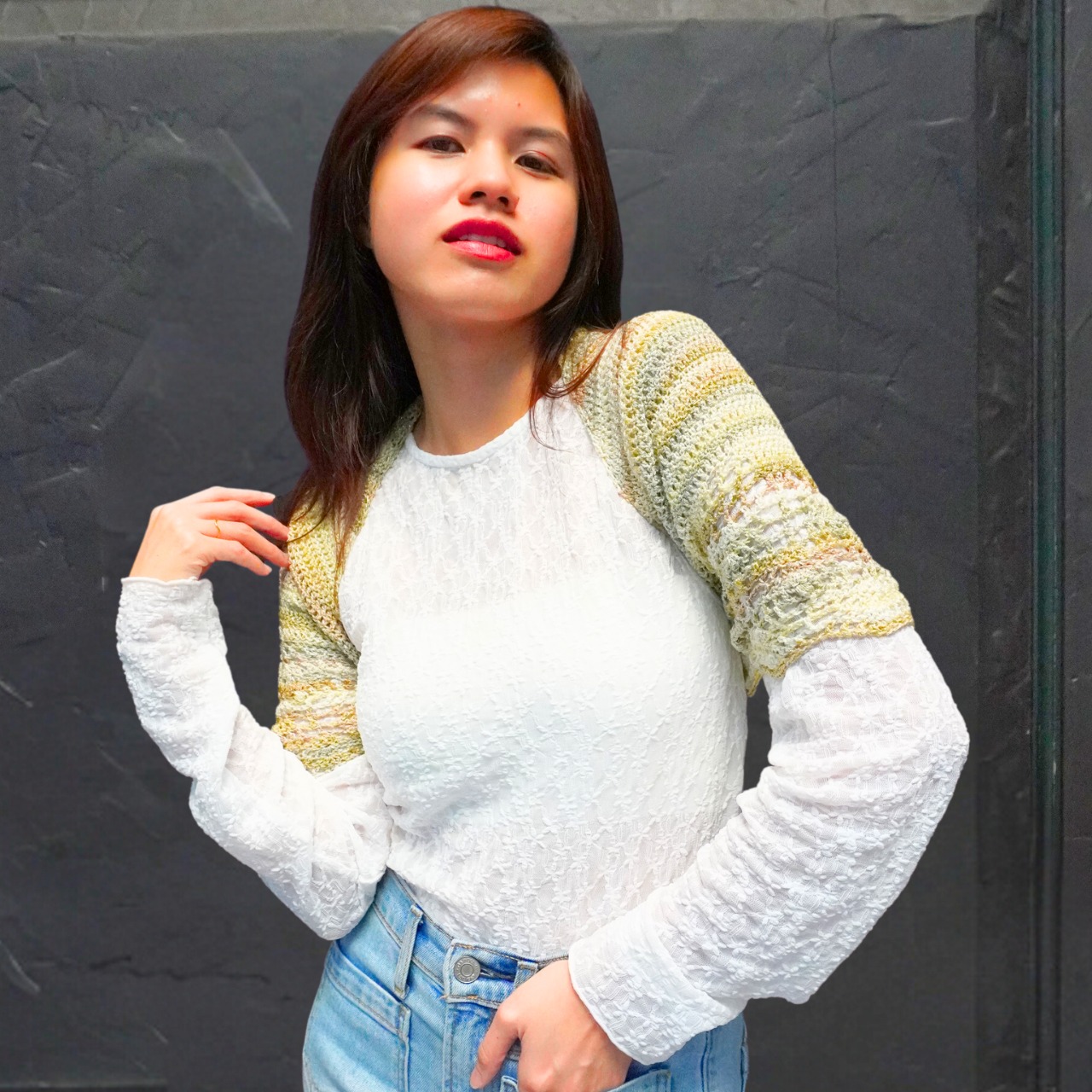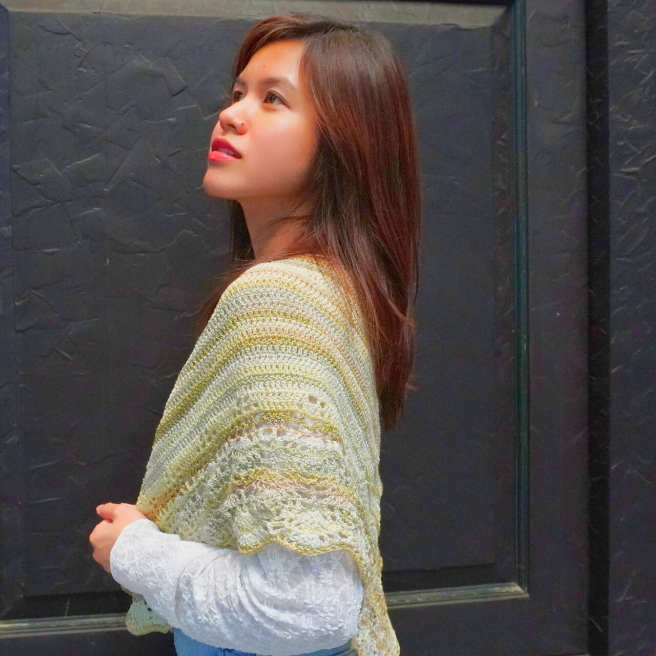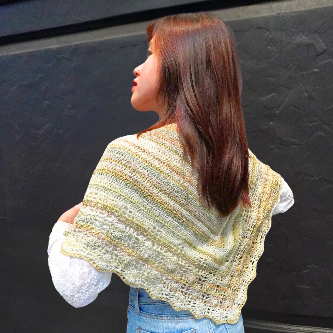 夢のあるデザインと、ハマナカ商店の「Linen Floria」(リネンフローリア)シリーズの華やかなグラデーションカラの毛糸から、このショールは生まれました。糸はリネンなので乾きやすく、湿気の多い夏場でも安心してお使いいただけます。また、春の涼しい季節に、ちょっと羽織りたいときにも使えるデザインです。