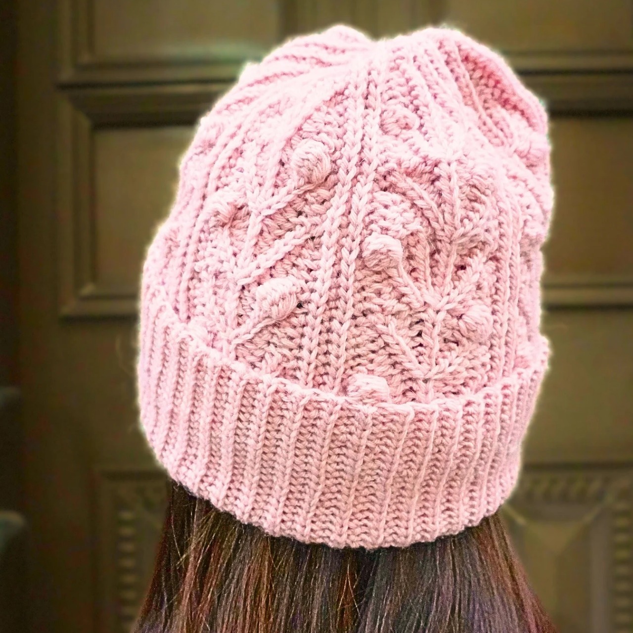 ビーニーのふくらみは、まだ枝についたままの小さなベリーが成長している様子を表現しています。色はもちろん変えられるのですが、ベリーへの敬意を表する、私の大好きなフルーツ、ストロベリーへの女子っぽくな憧れを込めて、さりげなくベビーピンクを選びました。